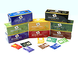 龙牌袋泡茶:品种有五种红茶、绿茶、花茶、龙井茶、乌龙茶、规格有100袋/盒,选用阿根廷、意玛机生产加工,定牌生产。